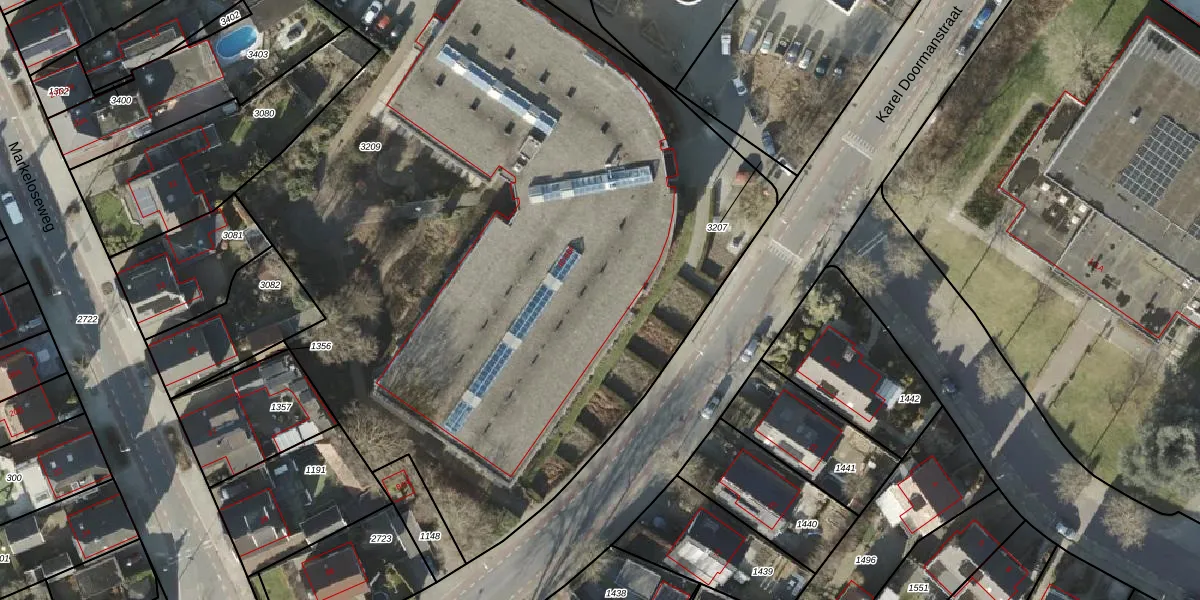 Het perceel waarop Karel Doormanstraat 56-B staat heeft een oppervlakte van 6655 m². Dit is een zeer groot perceel. De perceeloppervlakte wordt geregistreerd door het Kadaster. Gedetailleerde informatie over de maten van dit perceel kunt u vinden in het rapport Kadastrale kaart met maatvoering van Karel Doormanstraat 56-B.