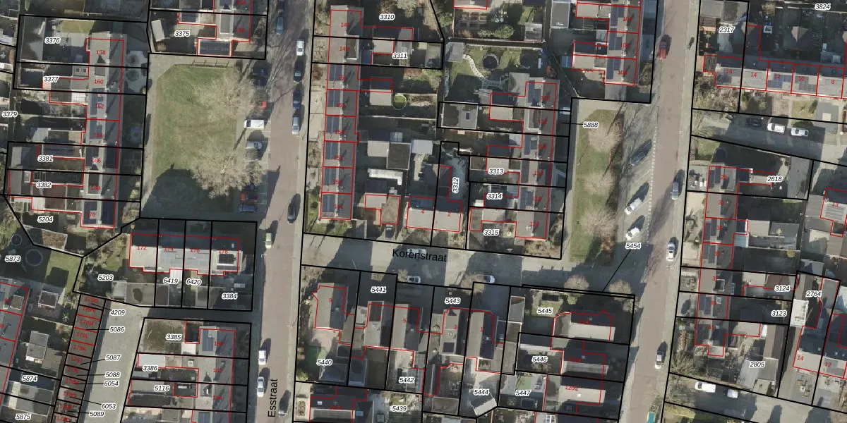 Het perceel waarop Korenstraat 4 staat heeft een oppervlakte van 6036 m². Dit is een zeer groot perceel. De perceeloppervlakte wordt geregistreerd door het Kadaster. Gedetailleerde informatie over de maten van dit perceel kunt u vinden in het rapport Kadastrale kaart met maatvoering van Korenstraat 4.
