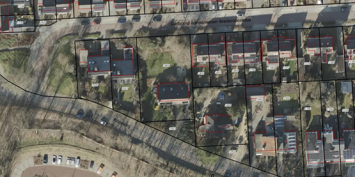 Het perceel waarop Kruisweg 7 staat heeft een oppervlakte van 1432 m². Dit is een zeer groot perceel. De perceeloppervlakte wordt geregistreerd door het Kadaster. Gedetailleerde informatie over de maten van dit perceel kunt u vinden in het rapport Kadastrale kaart met maatvoering van Kruisweg 7.