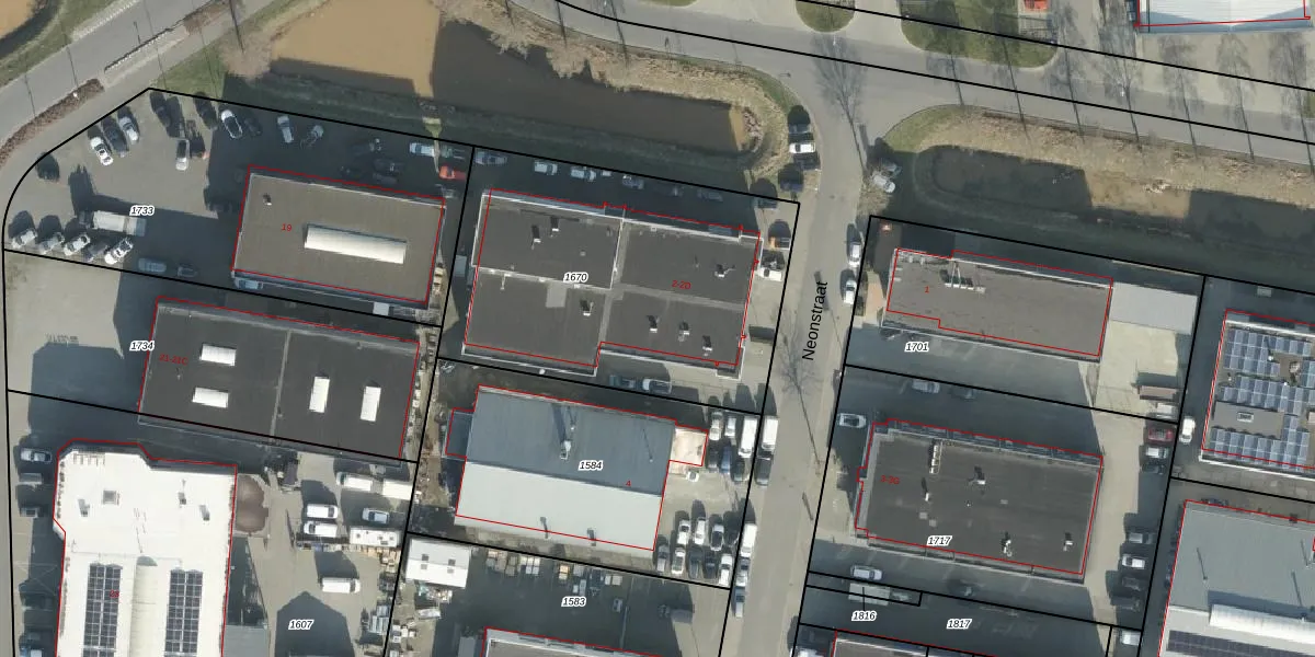 Het perceel waarop Neonstraat 2-C staat heeft een oppervlakte van 1643 m². Dit is een zeer groot perceel. De perceeloppervlakte wordt geregistreerd door het Kadaster. Gedetailleerde informatie over de maten van dit perceel kunt u vinden in het rapport Kadastrale kaart met maatvoering van Neonstraat 2-C.