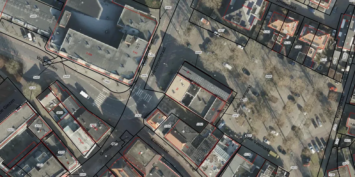 Het perceel waarop Oude Veemarkt 25 staat heeft een oppervlakte van 496 m². Dit is een groot perceel. De perceeloppervlakte wordt geregistreerd door het Kadaster. Gedetailleerde informatie over de maten van dit perceel kunt u vinden in het rapport Kadastrale kaart met maatvoering van Oude Veemarkt 25.