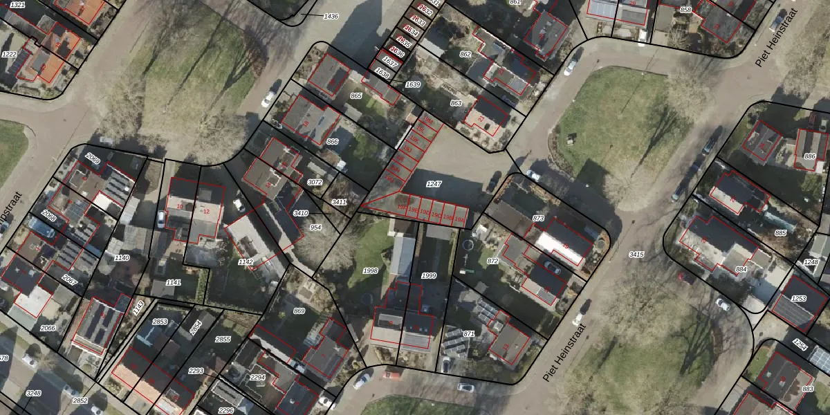 Het perceel waarop Piet Heinstraat 19-E staat heeft een oppervlakte van 628 m². Dit is een groot perceel. De perceeloppervlakte wordt geregistreerd door het Kadaster. Gedetailleerde informatie over de maten van dit perceel kunt u vinden in het rapport Kadastrale kaart met maatvoering van Piet Heinstraat 19-E.