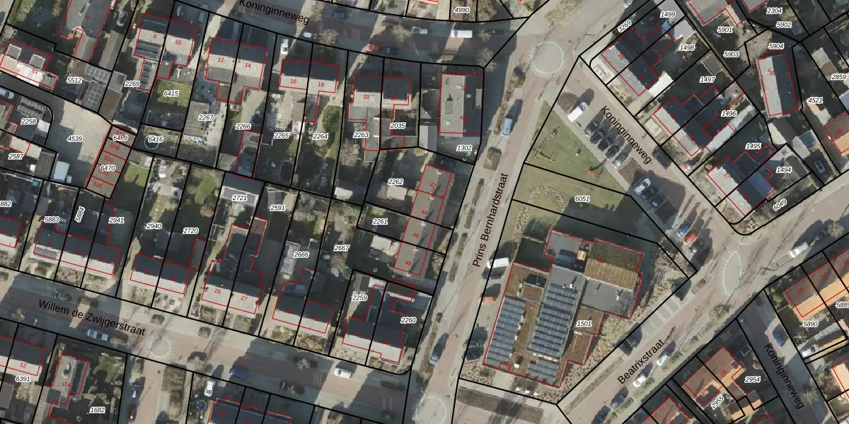 Het perceel waarop Prins Bernhardstraat 44 staat heeft een oppervlakte van 342 m². Dit is een groot perceel. De perceeloppervlakte wordt geregistreerd door het Kadaster. Gedetailleerde informatie over de maten van dit perceel kunt u vinden in het rapport Kadastrale kaart met maatvoering van Prins Bernhardstraat 44.