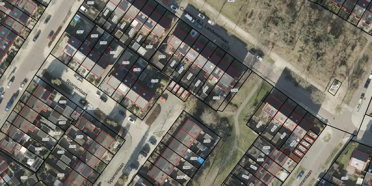 Het perceel waarop Sparrenlaan 15-D staat heeft een oppervlakte van 22 m². Dit is een klein perceel. De perceeloppervlakte wordt geregistreerd door het Kadaster. Gedetailleerde informatie over de maten van dit perceel kunt u vinden in het rapport Kadastrale kaart met maatvoering van Sparrenlaan 15-D.