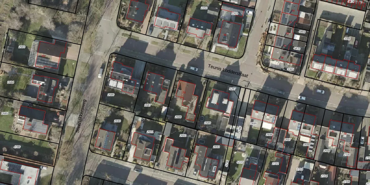 Het perceel waarop Teunis Lodderstraat 53 staat heeft een oppervlakte van 478 m². Dit is een groot perceel. De perceeloppervlakte wordt geregistreerd door het Kadaster. Gedetailleerde informatie over de maten van dit perceel kunt u vinden in het rapport Kadastrale kaart met maatvoering van Teunis Lodderstraat 53.
