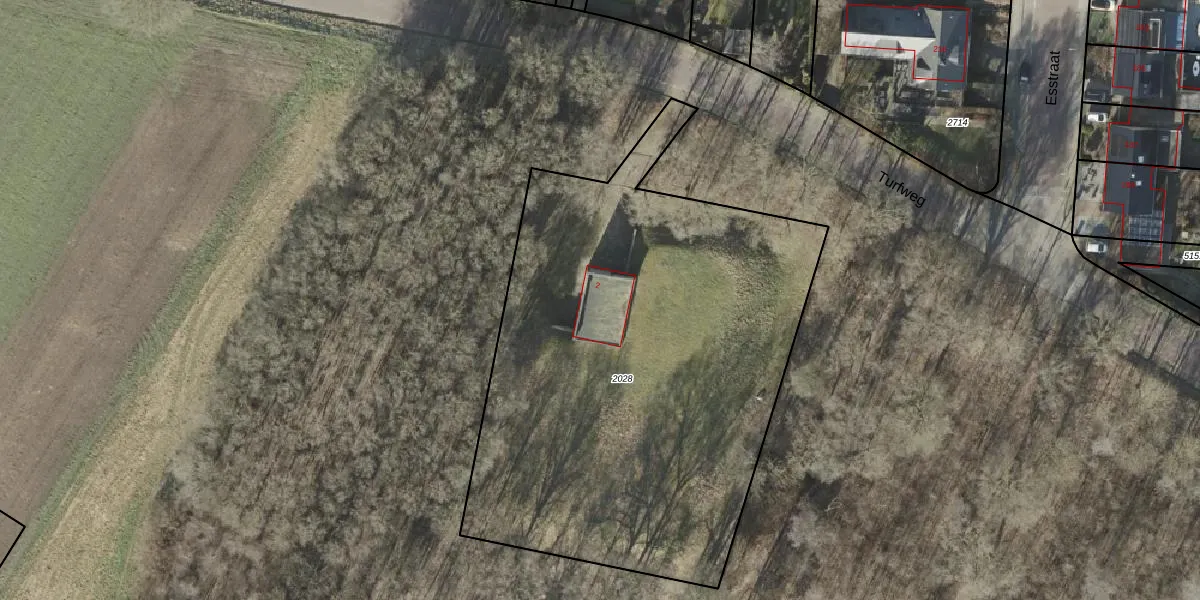 Het perceel waarop Turfweg 2 staat heeft een oppervlakte van 2995 m². Dit is een zeer groot perceel. De perceeloppervlakte wordt geregistreerd door het Kadaster. Gedetailleerde informatie over de maten van dit perceel kunt u vinden in het rapport Kadastrale kaart met maatvoering van Turfweg 2.