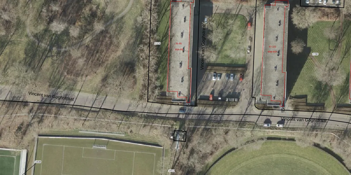 Het perceel waarop Vincent van Goghstraat 43 staat heeft een oppervlakte van 1797 m². Dit is een zeer groot perceel. De perceeloppervlakte wordt geregistreerd door het Kadaster. Gedetailleerde informatie over de maten van dit perceel kunt u vinden in het rapport Kadastrale kaart met maatvoering van Vincent van Goghstraat 43.