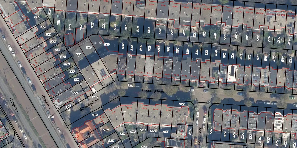 Het perceel waarop Bilderdijklaan 31 staat heeft een oppervlakte van 187 m². Dit is een middelgroot perceel. De perceeloppervlakte wordt geregistreerd door het Kadaster. Gedetailleerde informatie over de maten van dit perceel kunt u vinden in het rapport Kadastrale kaart met maatvoering van Bilderdijklaan 31.