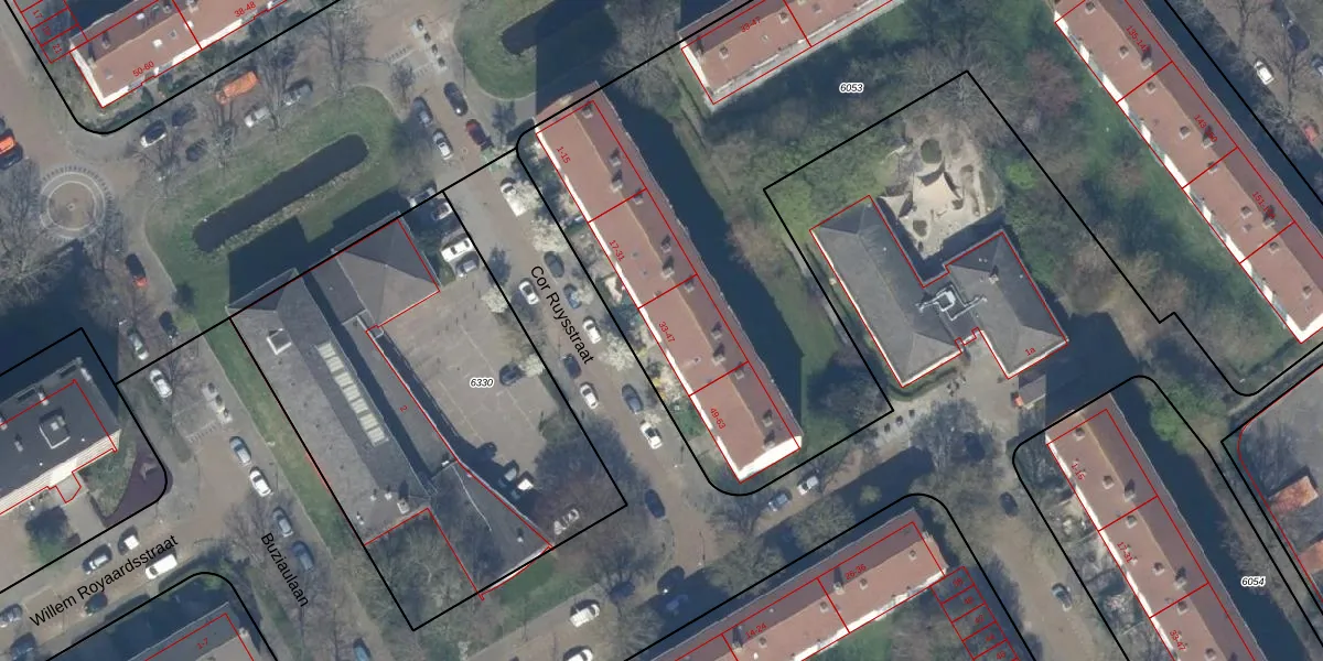 Cor Ruysstraat 33 is gelegen op kadastraal perceel RWK01D6053. Deze kadastrale aanduiding is uniek en wordt gebruikt door het Kadaster om eigendomsrechten en andere zakelijke rechten vast te leggen. Het perceel maakt onderdeel uit van de kadastrale gemeente Rijswijk.