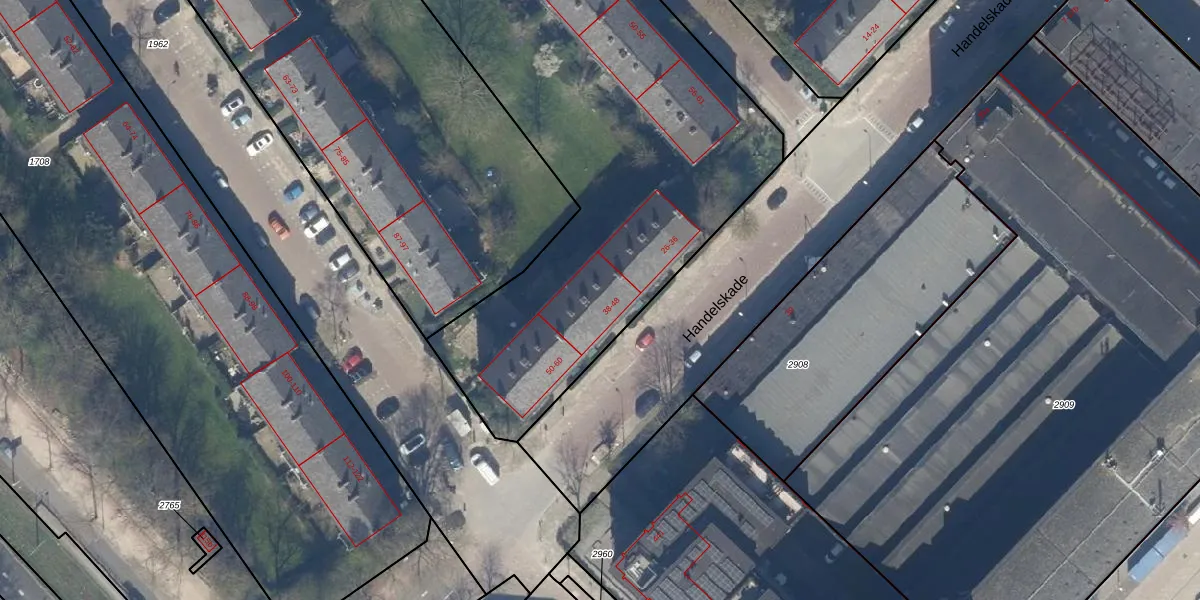 Het perceel waarop Handelskade 40 staat heeft een oppervlakte van 5200 m². Dit is een zeer groot perceel. De perceeloppervlakte wordt geregistreerd door het Kadaster. Gedetailleerde informatie over de maten van dit perceel kunt u vinden in het rapport Kadastrale kaart met maatvoering van Handelskade 40.