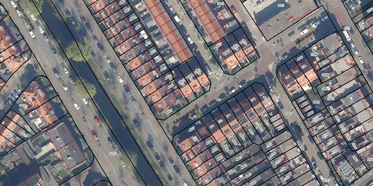 Julianastraat 68 is gelegen op kadastraal perceel RWK01D4874. Deze kadastrale aanduiding is uniek en wordt gebruikt door het Kadaster om eigendomsrechten en andere zakelijke rechten vast te leggen. Het perceel maakt onderdeel uit van de kadastrale gemeente Rijswijk.
