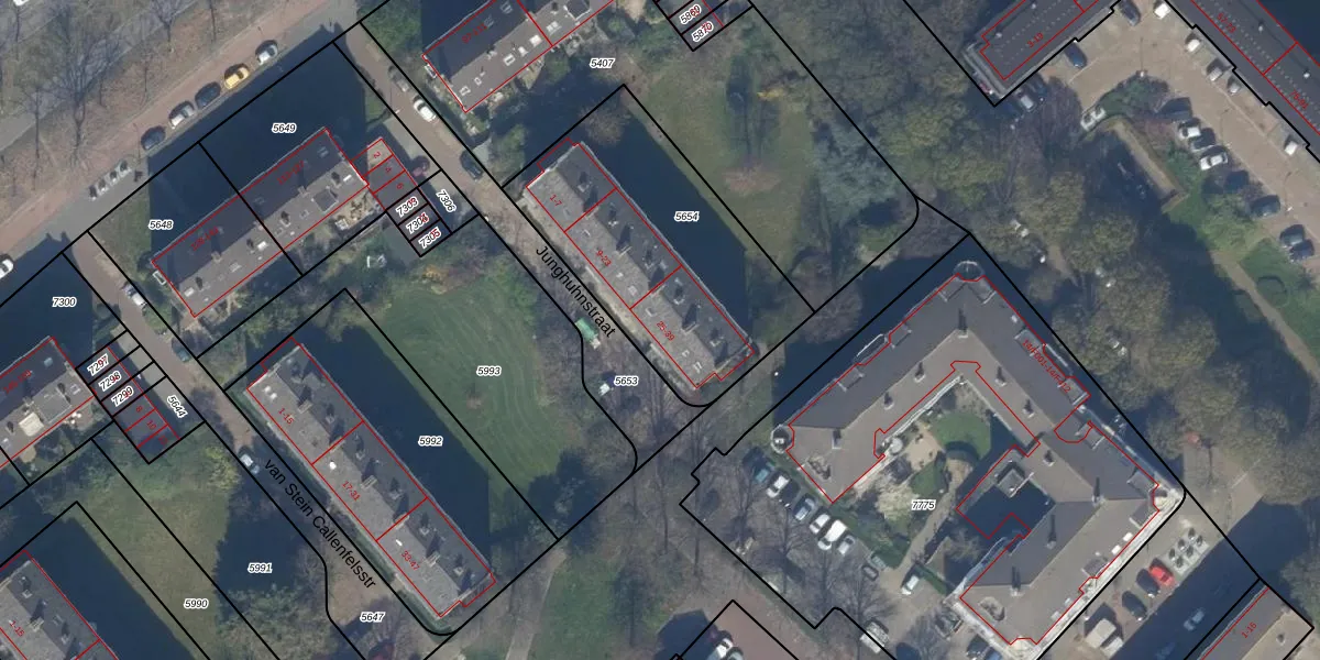 Het perceel waarop Junghuhnstraat 25 staat heeft een oppervlakte van 1087 m². Dit is een zeer groot perceel. De perceeloppervlakte wordt geregistreerd door het Kadaster. Gedetailleerde informatie over de maten van dit perceel kunt u vinden in het rapport Kadastrale kaart met maatvoering van Junghuhnstraat 25.