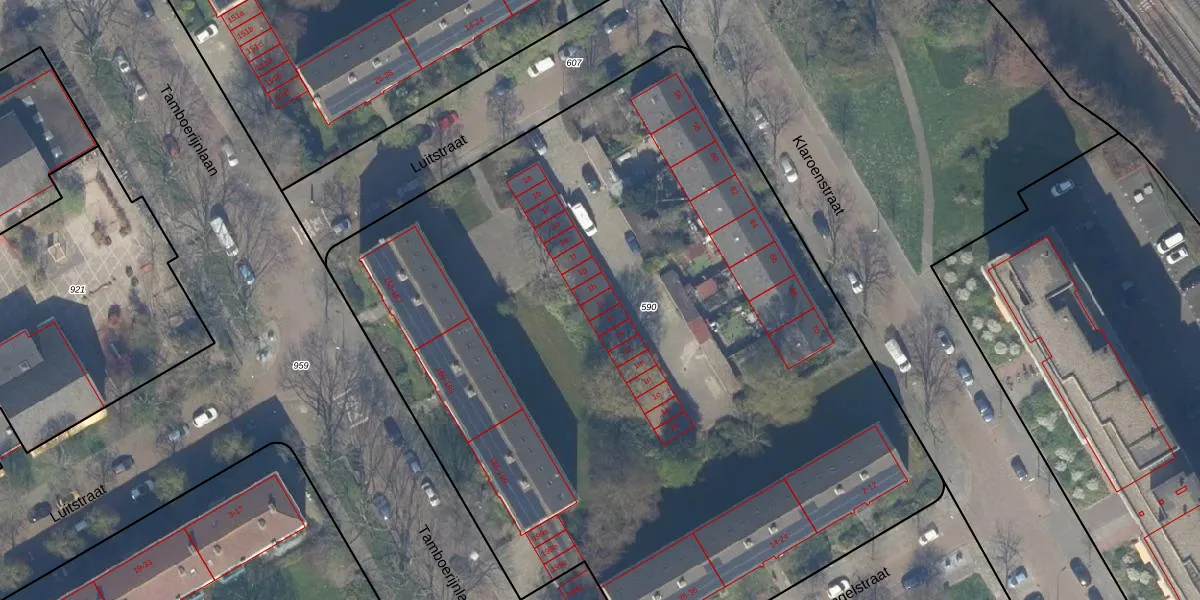 Het perceel waarop Luitstraat 1-i staat heeft een oppervlakte van 5947 m². Dit is een zeer groot perceel. De perceeloppervlakte wordt geregistreerd door het Kadaster. Gedetailleerde informatie over de maten van dit perceel kunt u vinden in het rapport Kadastrale kaart met maatvoering van Luitstraat 1-i.