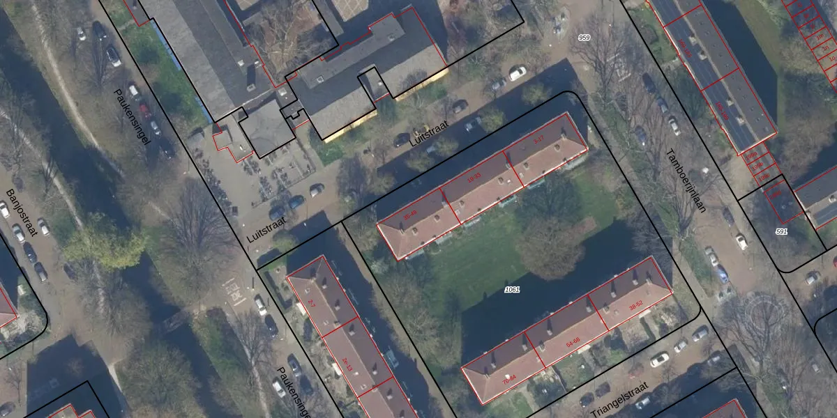 Het perceel waarop Luitstraat 43 staat heeft een oppervlakte van 4009 m². Dit is een zeer groot perceel. De perceeloppervlakte wordt geregistreerd door het Kadaster. Gedetailleerde informatie over de maten van dit perceel kunt u vinden in het rapport Kadastrale kaart met maatvoering van Luitstraat 43.
