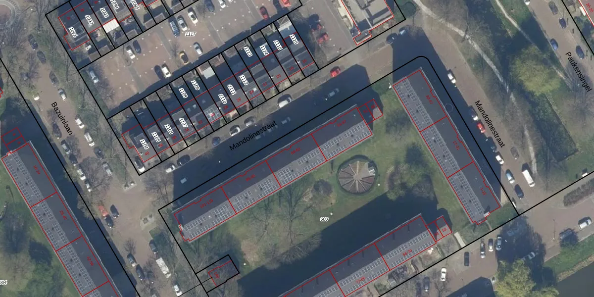 Het perceel waarop Mandolinestraat 77 staat heeft een oppervlakte van 6472 m². Dit is een zeer groot perceel. De perceeloppervlakte wordt geregistreerd door het Kadaster. Gedetailleerde informatie over de maten van dit perceel kunt u vinden in het rapport Kadastrale kaart met maatvoering van Mandolinestraat 77.