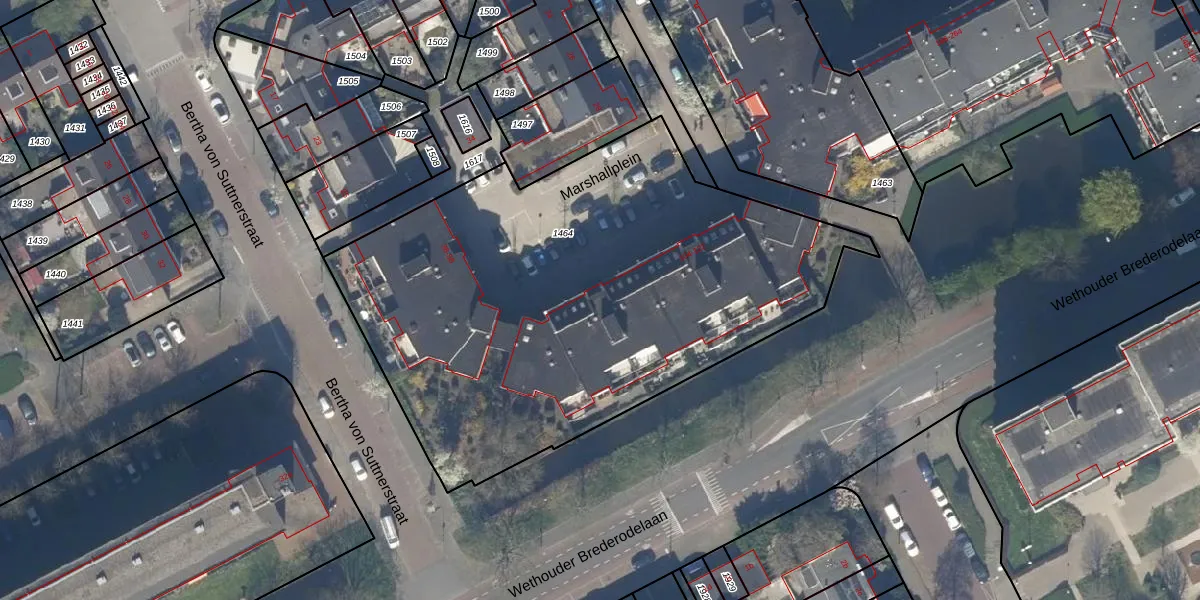 Het perceel waarop Marshallplein 86 staat heeft een oppervlakte van 2985 m². Dit is een zeer groot perceel. De perceeloppervlakte wordt geregistreerd door het Kadaster. Gedetailleerde informatie over de maten van dit perceel kunt u vinden in het rapport Kadastrale kaart met maatvoering van Marshallplein 86.