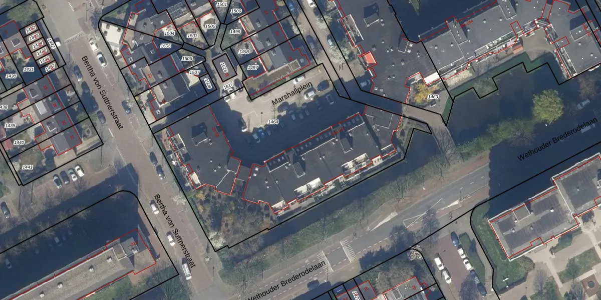 Het perceel waarop Marshallplein 96 staat heeft een oppervlakte van 2985 m². Dit is een zeer groot perceel. De perceeloppervlakte wordt geregistreerd door het Kadaster. Gedetailleerde informatie over de maten van dit perceel kunt u vinden in het rapport Kadastrale kaart met maatvoering van Marshallplein 96.