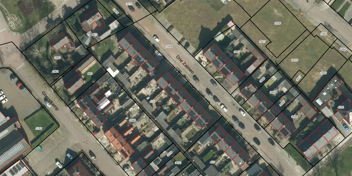 Het perceel waarop Drie Zalmen 12 staat heeft een oppervlakte van 2280 m². Dit is een zeer groot perceel. De perceeloppervlakte wordt geregistreerd door het Kadaster. Gedetailleerde informatie over de maten van dit perceel kunt u vinden in het rapport Kadastrale kaart met maatvoering van Drie Zalmen 12.