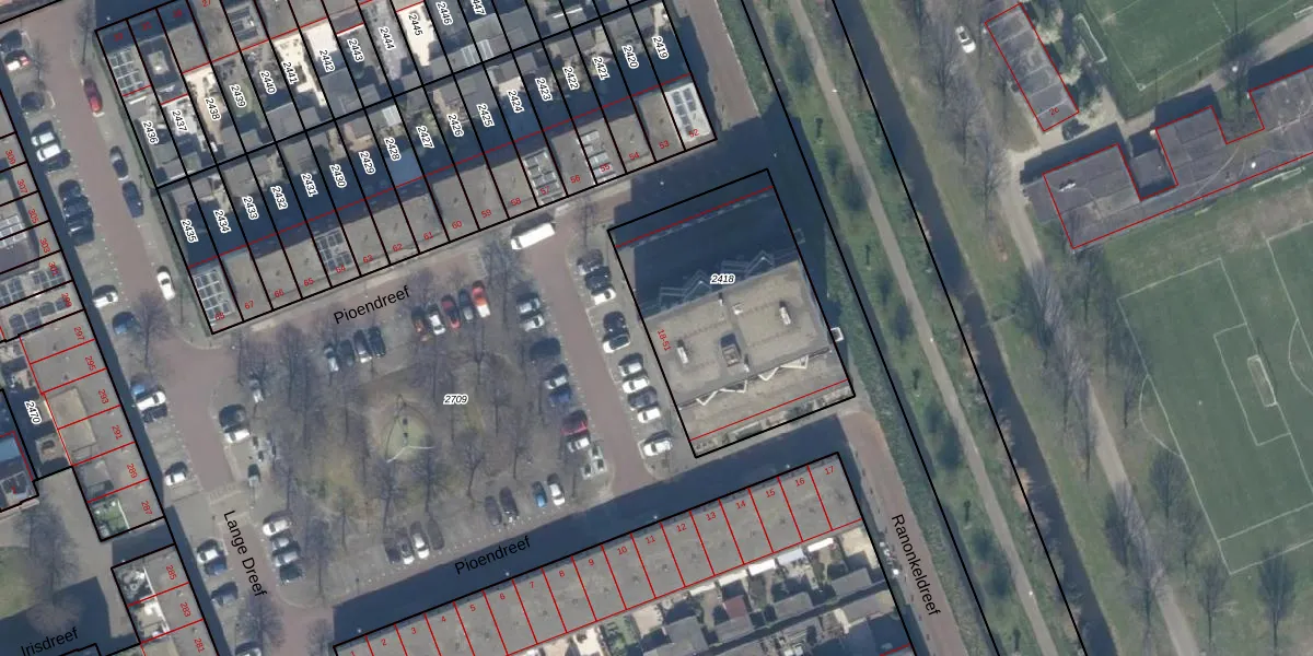 Pioendreef 23 is gelegen op kadastraal perceel RWK01C2418. Deze kadastrale aanduiding is uniek en wordt gebruikt door het Kadaster om eigendomsrechten en andere zakelijke rechten vast te leggen. Het perceel maakt onderdeel uit van de kadastrale gemeente Rijswijk.