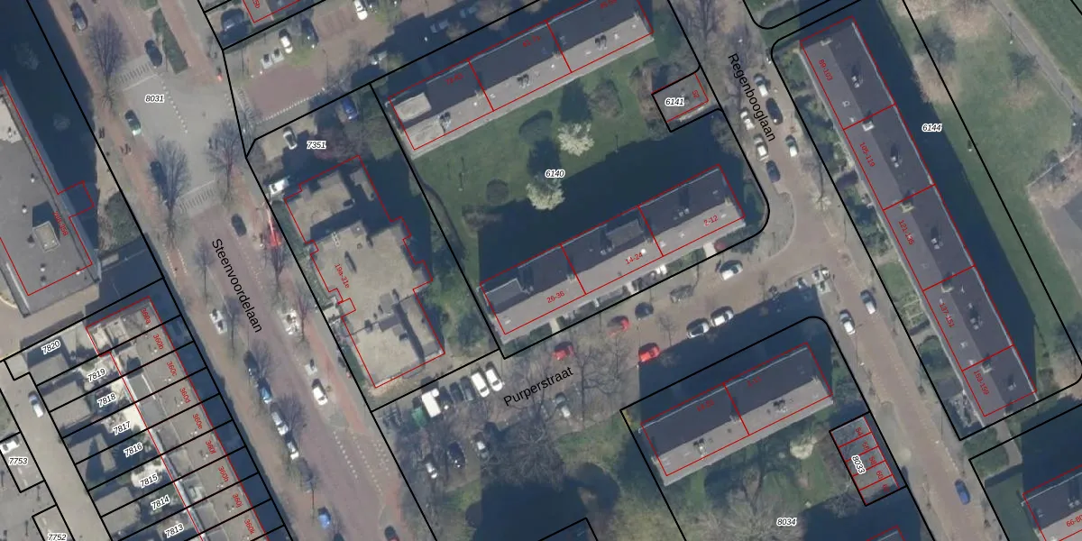 Het perceel waarop Purperstraat 30 staat heeft een oppervlakte van 3107 m². Dit is een zeer groot perceel. De perceeloppervlakte wordt geregistreerd door het Kadaster. Gedetailleerde informatie over de maten van dit perceel kunt u vinden in het rapport Kadastrale kaart met maatvoering van Purperstraat 30.