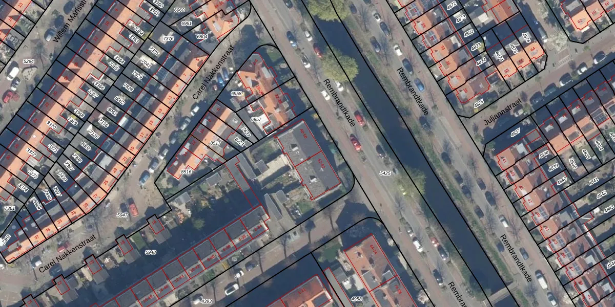 Het perceel waarop Rembrandtkade 48 staat heeft een oppervlakte van 5875 m². Dit is een zeer groot perceel. De perceeloppervlakte wordt geregistreerd door het Kadaster. Gedetailleerde informatie over de maten van dit perceel kunt u vinden in het rapport Kadastrale kaart met maatvoering van Rembrandtkade 48.