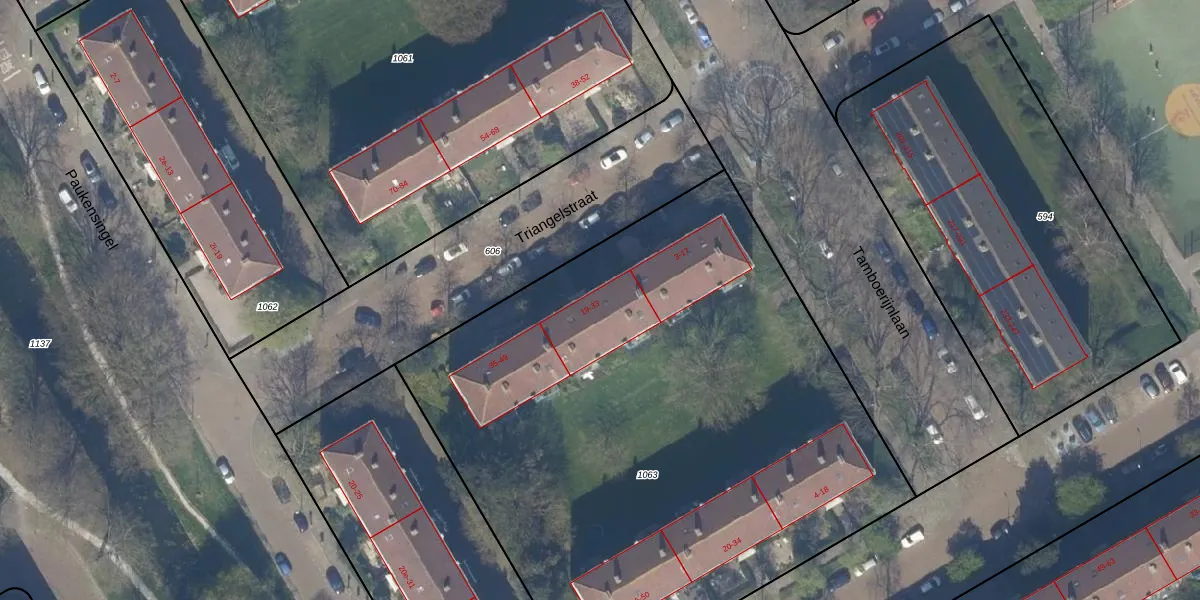 Het perceel waarop Triangelstraat 27 staat heeft een oppervlakte van 4045 m². Dit is een zeer groot perceel. De perceeloppervlakte wordt geregistreerd door het Kadaster. Gedetailleerde informatie over de maten van dit perceel kunt u vinden in het rapport Kadastrale kaart met maatvoering van Triangelstraat 27.