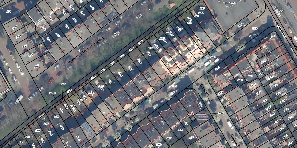 Tulpstraat 105 is gelegen op kadastraal perceel RWK01A2356. Deze kadastrale aanduiding is uniek en wordt gebruikt door het Kadaster om eigendomsrechten en andere zakelijke rechten vast te leggen. Het perceel maakt onderdeel uit van de kadastrale gemeente Rijswijk.