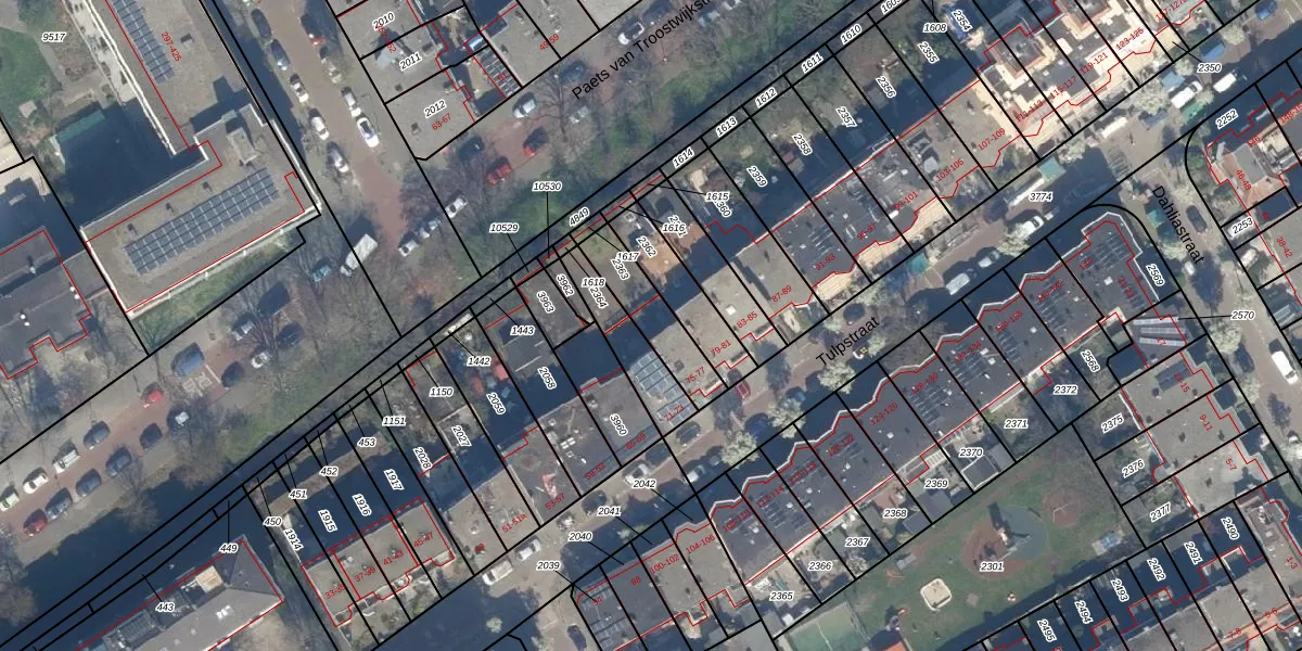 Het perceel waarop Tulpstraat 75 staat heeft een oppervlakte van 184 m². Dit is een middelgroot perceel. De perceeloppervlakte wordt geregistreerd door het Kadaster. Gedetailleerde informatie over de maten van dit perceel kunt u vinden in het rapport Kadastrale kaart met maatvoering van Tulpstraat 75.