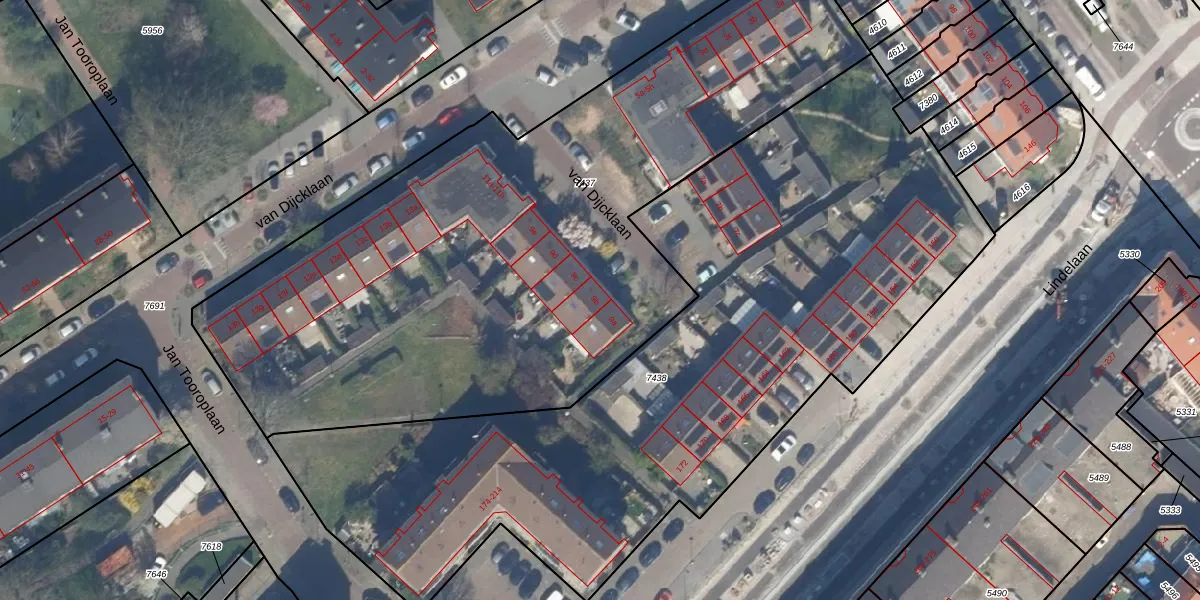 Het perceel waarop van Dijcklaan 9-b staat heeft een oppervlakte van 3775 m². Dit is een zeer groot perceel. De perceeloppervlakte wordt geregistreerd door het Kadaster. Gedetailleerde informatie over de maten van dit perceel kunt u vinden in het rapport Kadastrale kaart met maatvoering van van Dijcklaan 9-b.
