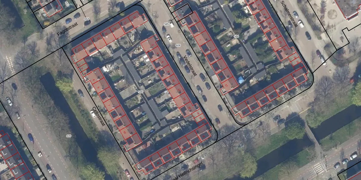 Het perceel waarop Vedelstraat 12 staat heeft een oppervlakte van 4421 m². Dit is een zeer groot perceel. De perceeloppervlakte wordt geregistreerd door het Kadaster. Gedetailleerde informatie over de maten van dit perceel kunt u vinden in het rapport Kadastrale kaart met maatvoering van Vedelstraat 12.