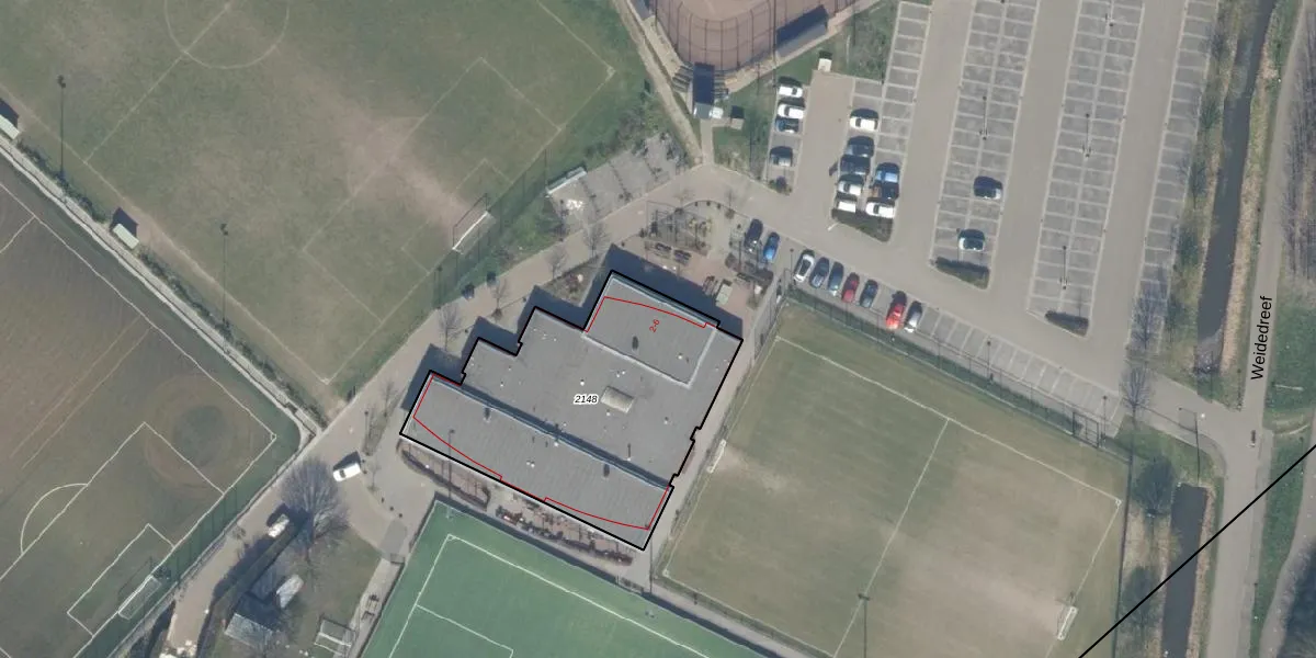 Weidedreef 2 is gelegen op kadastraal perceel RWK01I2148. Deze kadastrale aanduiding is uniek en wordt gebruikt door het Kadaster om eigendomsrechten en andere zakelijke rechten vast te leggen. Het perceel maakt onderdeel uit van de kadastrale gemeente Rijswijk.