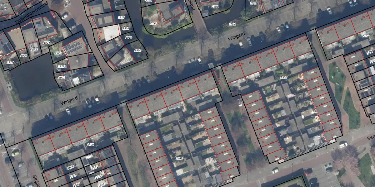 Het perceel waarop Wingerd 39 staat heeft een oppervlakte van 2715 m². Dit is een zeer groot perceel. De perceeloppervlakte wordt geregistreerd door het Kadaster. Gedetailleerde informatie over de maten van dit perceel kunt u vinden in het rapport Kadastrale kaart met maatvoering van Wingerd 39.