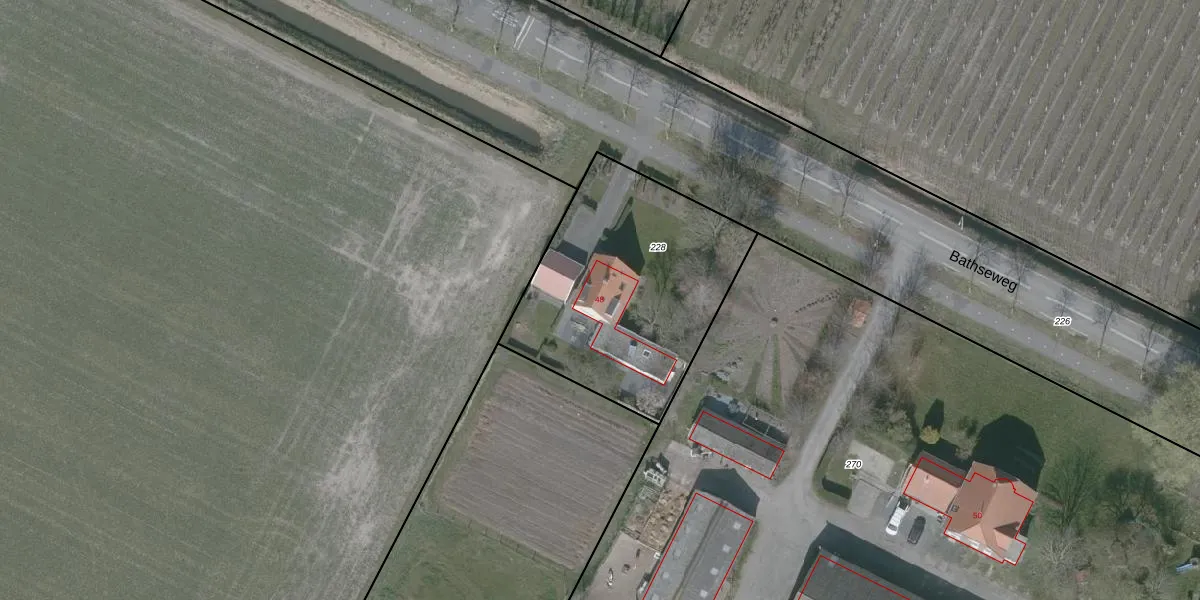 Het perceel waarop Bathseweg 48 staat heeft een oppervlakte van 1075 m². Dit is een zeer groot perceel. De perceeloppervlakte wordt geregistreerd door het Kadaster. Gedetailleerde informatie over de maten van dit perceel kunt u vinden in het rapport Kadastrale kaart met maatvoering van Bathseweg 48.