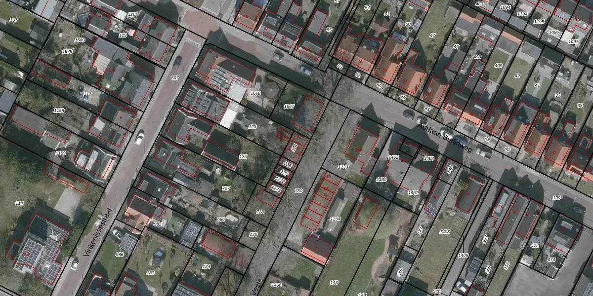 Het perceel waarop De Veste 12-A staat heeft een oppervlakte van 61 m². Dit is een klein perceel. De perceeloppervlakte wordt geregistreerd door het Kadaster. Gedetailleerde informatie over de maten van dit perceel kunt u vinden in het rapport Kadastrale kaart met maatvoering van De Veste 12-A.