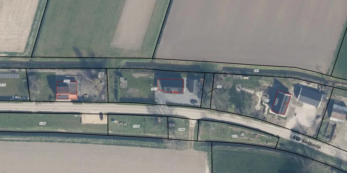 Het perceel waarop Lodderlandsedijk 42-a staat heeft een oppervlakte van 1095 m². Dit is een zeer groot perceel. De perceeloppervlakte wordt geregistreerd door het Kadaster. Gedetailleerde informatie over de maten van dit perceel kunt u vinden in het rapport Kadastrale kaart met maatvoering van Lodderlandsedijk 42-a.