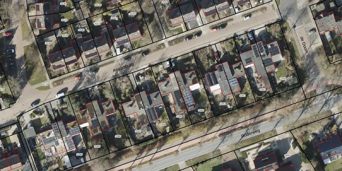 Assumburg 12 is gelegen op kadastraal perceel RDN01K3349. Deze kadastrale aanduiding is uniek en wordt gebruikt door het Kadaster om eigendomsrechten en andere zakelijke rechten vast te leggen. Het perceel maakt onderdeel uit van de kadastrale gemeente Roden.