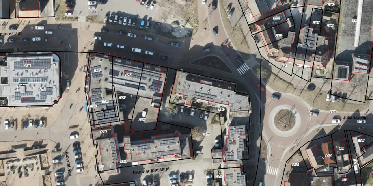 Het perceel waarop Bernhardpassage 4 staat heeft een oppervlakte van 1090 m². Dit is een zeer groot perceel. De perceeloppervlakte wordt geregistreerd door het Kadaster. Gedetailleerde informatie over de maten van dit perceel kunt u vinden in het rapport Kadastrale kaart met maatvoering van Bernhardpassage 4.