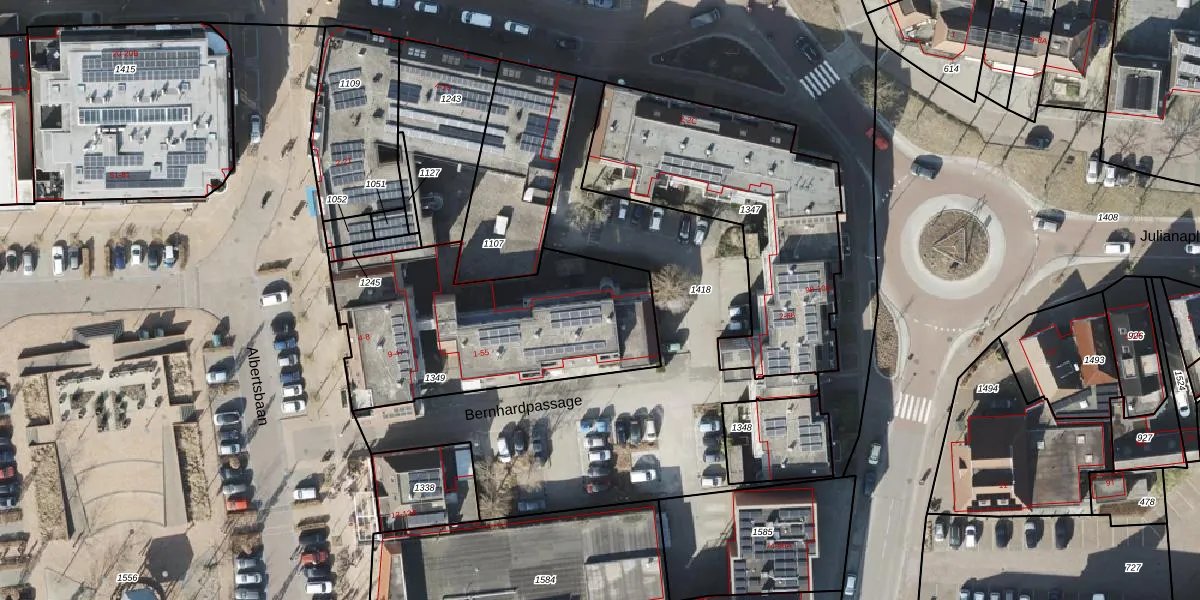 Het perceel waarop Bernhardpassage 55 staat heeft een oppervlakte van 1101 m². Dit is een zeer groot perceel. De perceeloppervlakte wordt geregistreerd door het Kadaster. Gedetailleerde informatie over de maten van dit perceel kunt u vinden in het rapport Kadastrale kaart met maatvoering van Bernhardpassage 55.