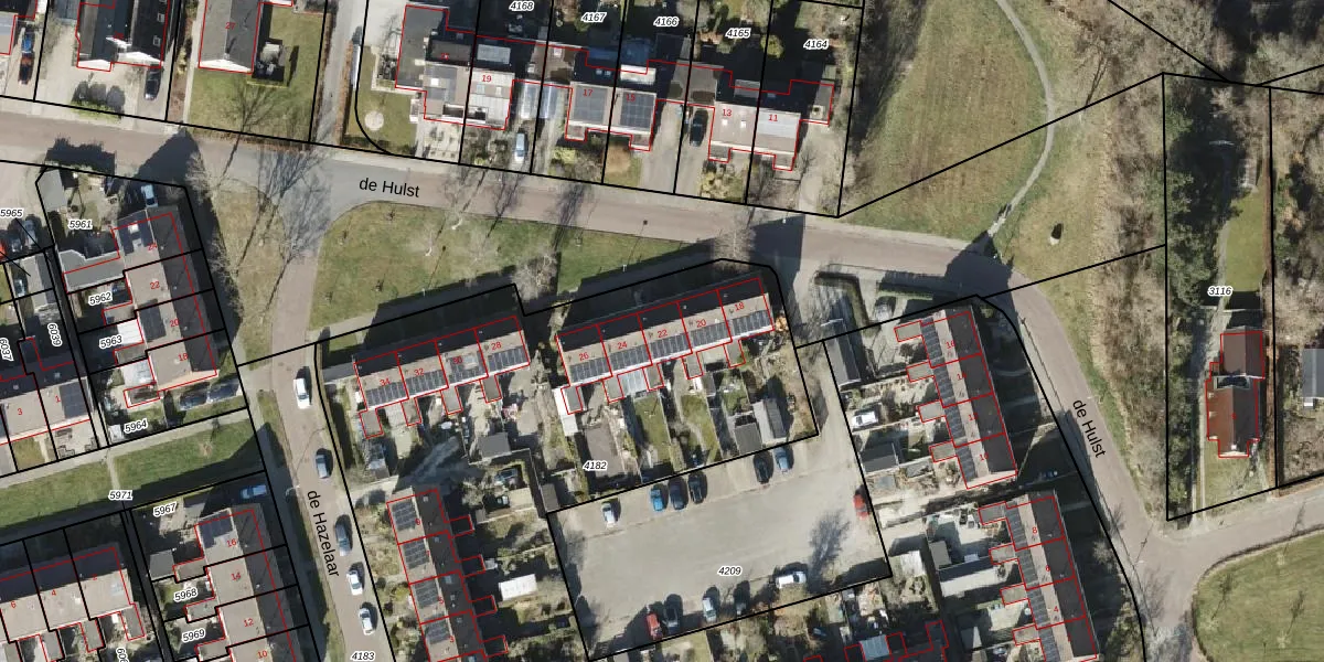 Het perceel waarop de Hulst 22 staat heeft een oppervlakte van 6975 m². Dit is een zeer groot perceel. De perceeloppervlakte wordt geregistreerd door het Kadaster. Gedetailleerde informatie over de maten van dit perceel kunt u vinden in het rapport Kadastrale kaart met maatvoering van de Hulst 22.