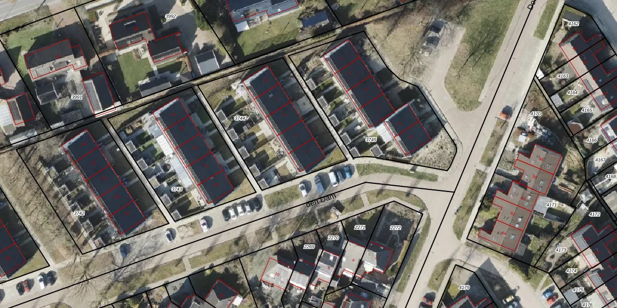 den Dam 1 is gelegen op kadastraal perceel RDN01H3744. Deze kadastrale aanduiding is uniek en wordt gebruikt door het Kadaster om eigendomsrechten en andere zakelijke rechten vast te leggen. Het perceel maakt onderdeel uit van de kadastrale gemeente Roden.