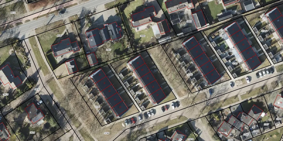den Dam 33 is gelegen op kadastraal perceel RDN01H3741. Deze kadastrale aanduiding is uniek en wordt gebruikt door het Kadaster om eigendomsrechten en andere zakelijke rechten vast te leggen. Het perceel maakt onderdeel uit van de kadastrale gemeente Roden.