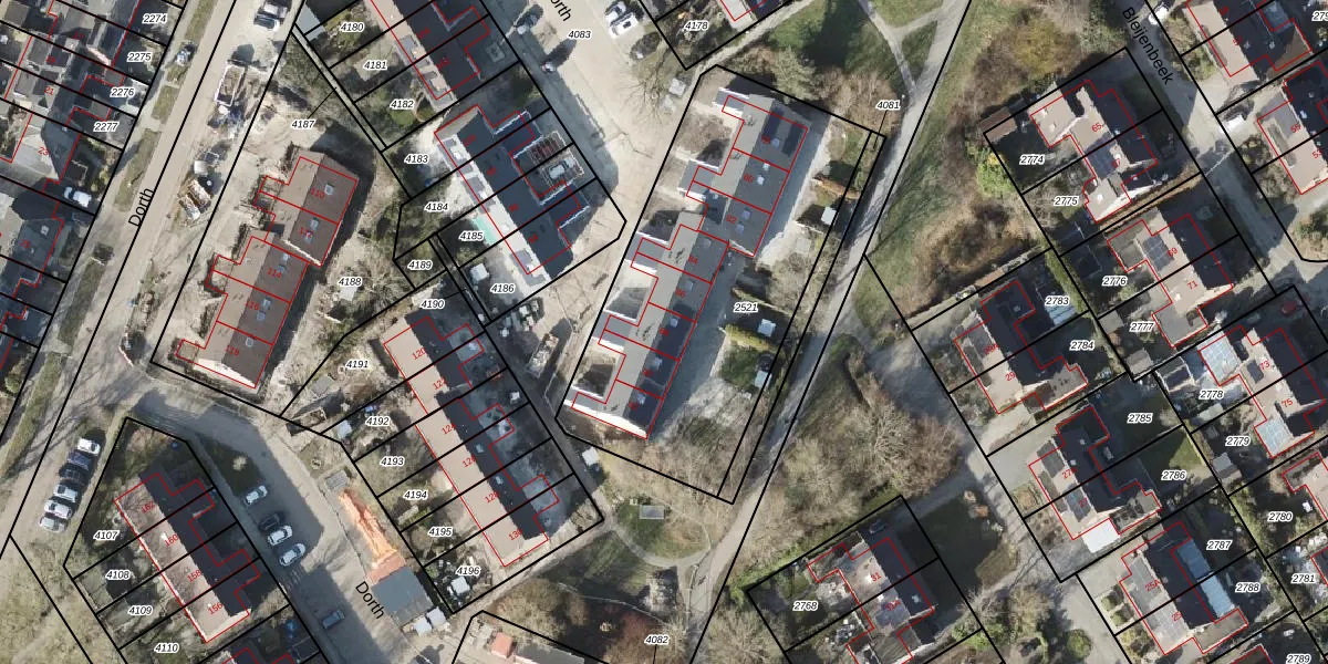 Het perceel waarop Dorth 88 staat heeft een oppervlakte van 1614 m². Dit is een zeer groot perceel. De perceeloppervlakte wordt geregistreerd door het Kadaster. Gedetailleerde informatie over de maten van dit perceel kunt u vinden in het rapport Kadastrale kaart met maatvoering van Dorth 88.