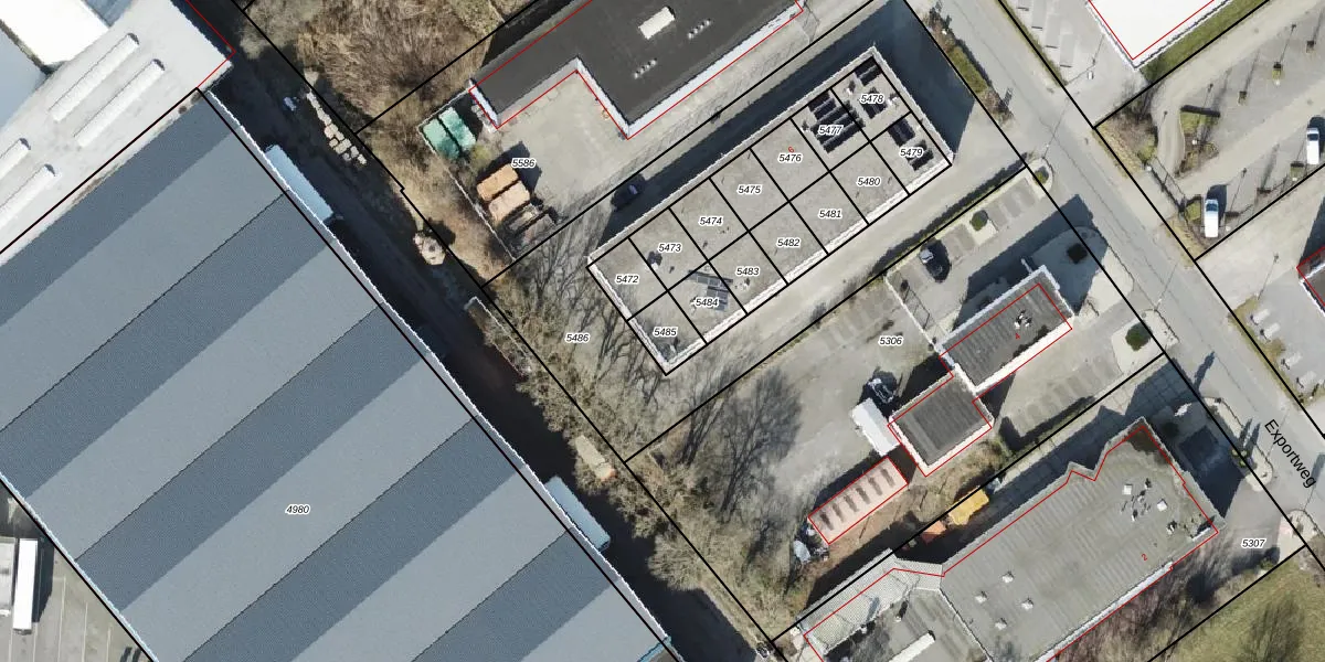 Exportweg 6-14 is gelegen op kadastraal perceel RDN01I5485. Deze kadastrale aanduiding is uniek en wordt gebruikt door het Kadaster om eigendomsrechten en andere zakelijke rechten vast te leggen. Het perceel maakt onderdeel uit van de kadastrale gemeente Roden.