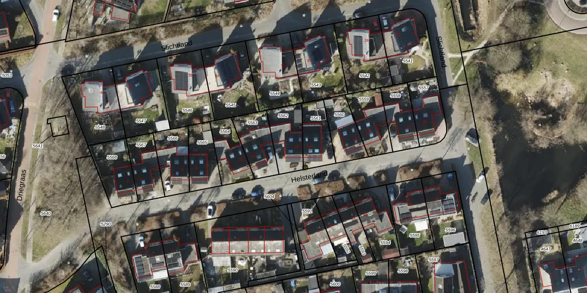 Helsterland 14 is gelegen op kadastraal perceel RDN01K5562. Deze kadastrale aanduiding is uniek en wordt gebruikt door het Kadaster om eigendomsrechten en andere zakelijke rechten vast te leggen. Het perceel maakt onderdeel uit van de kadastrale gemeente Roden.