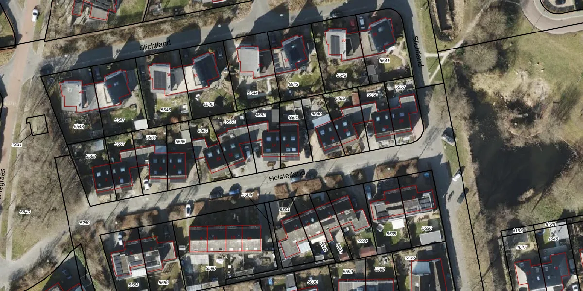 Helsterland 16 is gelegen op kadastraal perceel RDN01K5561. Deze kadastrale aanduiding is uniek en wordt gebruikt door het Kadaster om eigendomsrechten en andere zakelijke rechten vast te leggen. Het perceel maakt onderdeel uit van de kadastrale gemeente Roden.