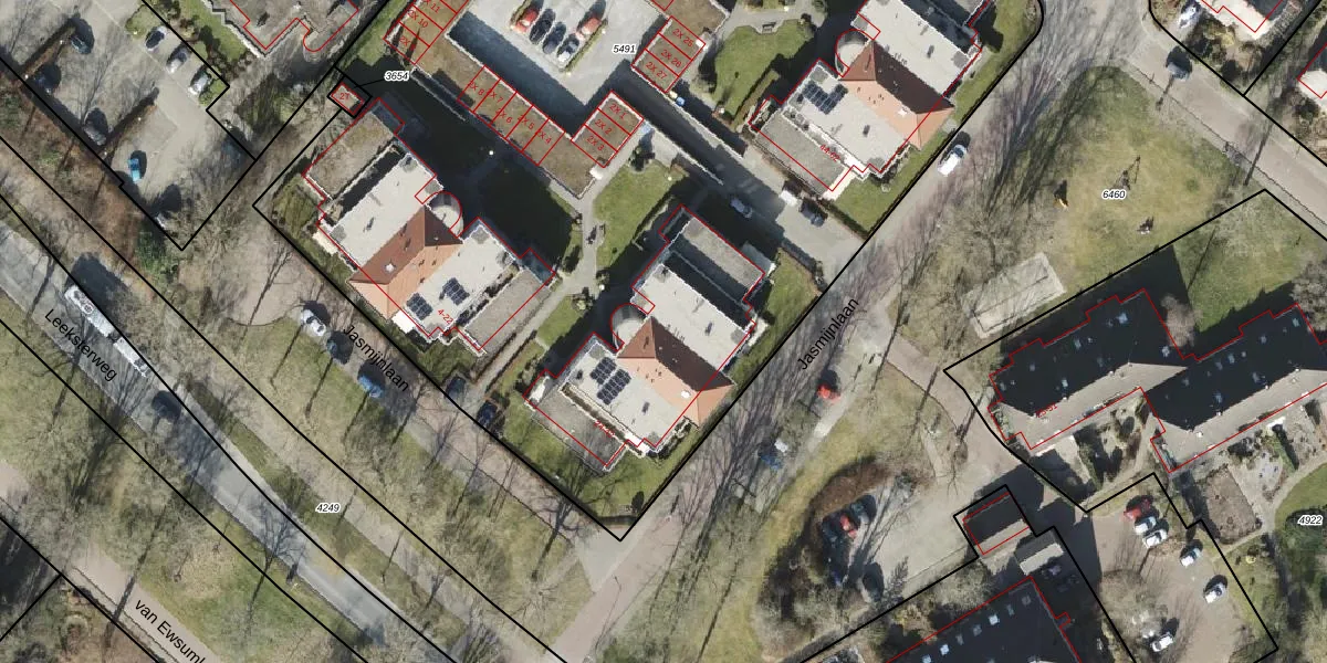 Jasmijnlaan 34 is gelegen op kadastraal perceel RDN01I5491. Deze kadastrale aanduiding is uniek en wordt gebruikt door het Kadaster om eigendomsrechten en andere zakelijke rechten vast te leggen. Het perceel maakt onderdeel uit van de kadastrale gemeente Roden.