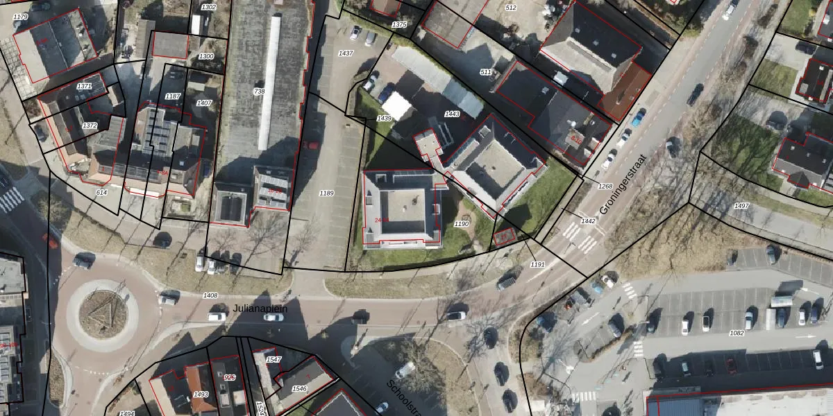 Het adres ligt op het perceel RDN01-M-1190, dat zich in de kadastrale gemeente Roden bevindt. Het perceel is kleiner dan gemiddeld in Roden. Het perceel is 860 m² groot, terwijl het gemiddelde ligt op 5503,52 m². De grootste perceeloppervlakte in de kadastrale gemeente is 1,51 km². De kleinste oppervlakte bedraagt 0 m². Op het perceel zijn 8 adressen aanwezig. In de Basisregistratie Kadaster (BRK) werden de grenzen van het perceel geregistreerd op 28-11-2003.