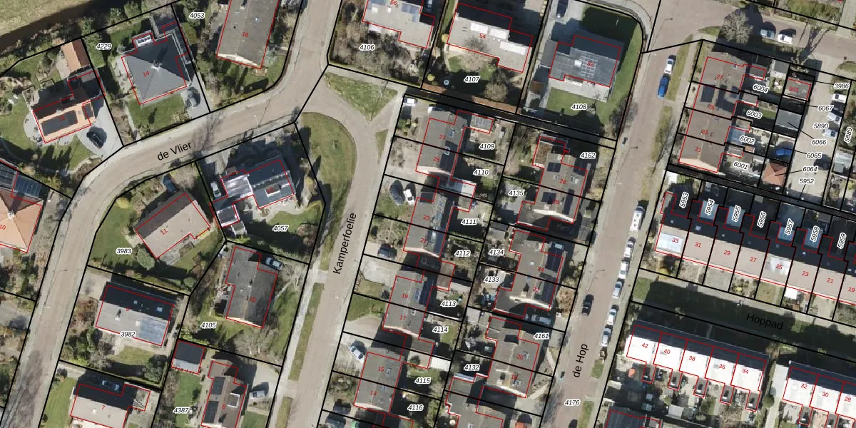 Kamperfoelie 23 is gelegen op kadastraal perceel RDN01I4111. Deze kadastrale aanduiding is uniek en wordt gebruikt door het Kadaster om eigendomsrechten en andere zakelijke rechten vast te leggen. Het perceel maakt onderdeel uit van de kadastrale gemeente Roden.
