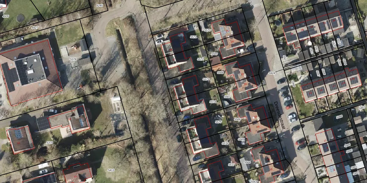 Het perceel waarop Koeriersstraat 15 staat heeft een oppervlakte van 313 m². Dit is een groot perceel. De perceeloppervlakte wordt geregistreerd door het Kadaster. Gedetailleerde informatie over de maten van dit perceel kunt u vinden in het rapport Kadastrale kaart met maatvoering van Koeriersstraat 15.
