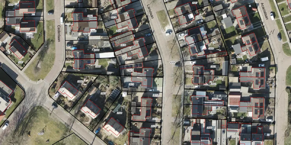 Larixlaan 24 is gelegen op kadastraal perceel RDN01I2674. Deze kadastrale aanduiding is uniek en wordt gebruikt door het Kadaster om eigendomsrechten en andere zakelijke rechten vast te leggen. Het perceel maakt onderdeel uit van de kadastrale gemeente Roden.